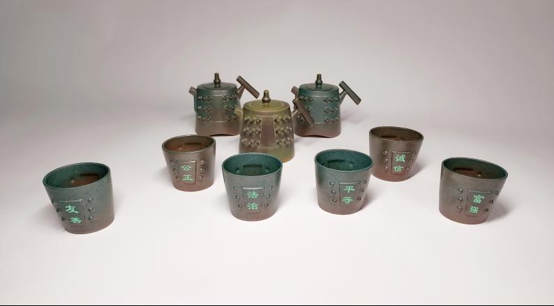 聂建民创作的《警钟长鸣》,以齐文化“编钟”为灵感,设计了一套以“警钟长鸣”为主题的茶器。杯身雕刻社会主义核心价值观“富强、民主、文明、和谐、自由、平等、公正、法治、爱国、敬业、诚信、友善”,寓意深远,时刻警醒大家不忘初心、牢记使命。