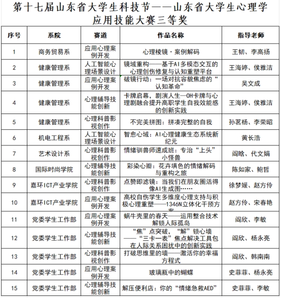 王韧等指导的团队作品《心理棱镜·案例解码》等15个作品获三等奖。
