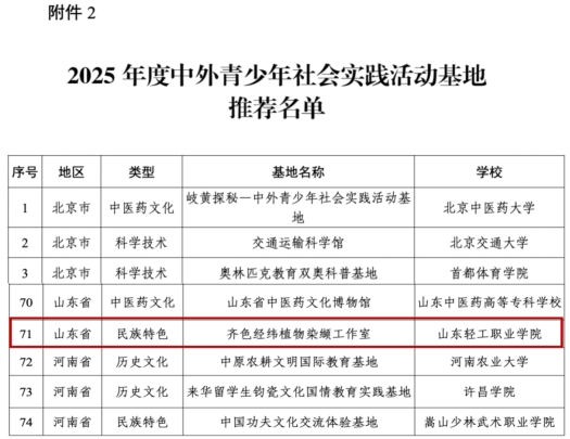 本站讯(通讯员 侯梦璇)山东轻工职业学院与淄博海润丝绸发展有限公司共建的“齐色经纬植物染缬工作室”近日成功获批为国家级中外青少年社会实践活动基地。这一认定是学校在国际交流与中华优秀传统文化传承领域深化产教融合、推进校企合作的重要成果,也标志着学校在丝绸文化和非遗文化育人与实践平台建设方面迈上新台阶。