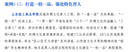 本站讯(通讯员 滕恣卉)近日,山东省教育厅发布《山东省职业教育质量报告(2025年度)》,山东轻工职业学院丝绸文化育人工程案例入选“打造一校一品,强化特色育人”案例。