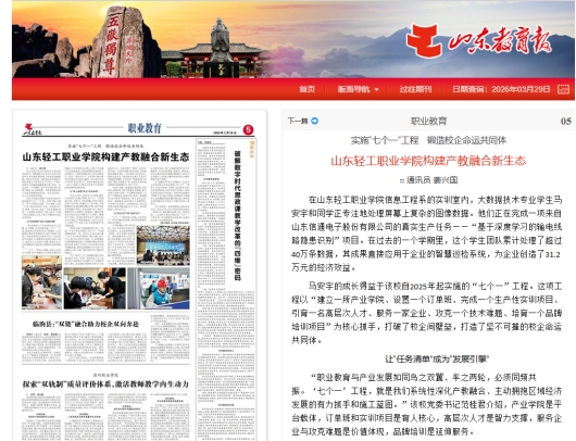 本站讯(通讯员 姜兴国)近日,山东教育报专题报道我校“七个一”工程优秀典型经验,介绍我校以“建立一所产业学院、设置一个订单班、完成一个生产性实训项目、引育一名高层次人才、服务一家企业、攻克一个技术难题、培育一个品牌培训项目”为核心抓手,打破校企合作壁垒,打造校企命运共同体的范例。